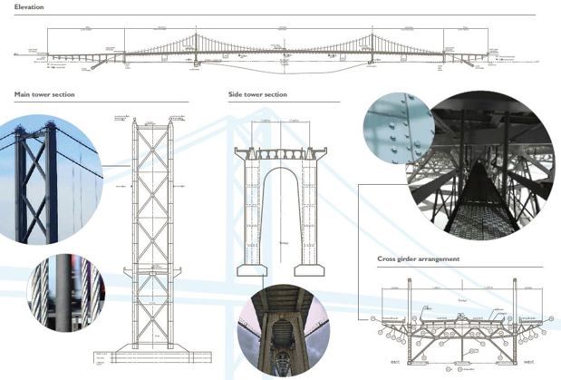 The two main aerially spun cables from which the suspended deck is hung are 590 mm in diameter, and each is made up of 11,618 high tensile wires with a 4.98 mm diameter. The suspended deck is made up of a steel stiffening truss, with three longitudinal air gaps at roadway level to improve aerodynamic stability.