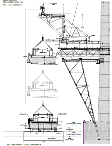 Each deck segment is transported out from the dockside fabrication yard on one of two huge barges and positioned at the tower by tugs. On arrival, the barge is anchored – to within a 20cm tolerance - beneath the blue traveller gantries at deck level (so that’s what those blue ‘wings’ either side of each tower are for!). These travellers will lift the deck segment up to deck height (approximately 55 metres) in a delicate three hour operation which is very sensitive to wind, sea and tide conditions. Each deck segment is then rotated by a few degrees in order to match the final geometry of the bridge design and a series of interlocking plates are joined together to hold the structures in place.