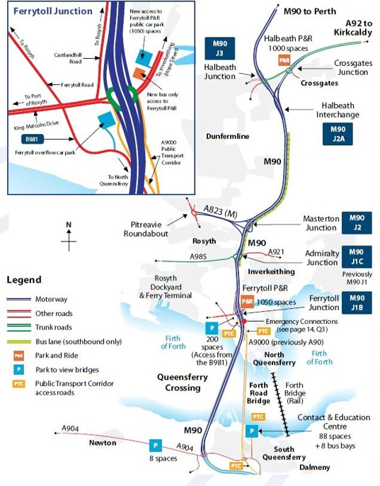 Vehicles permitted to use the Forth Road Bridge can use the access roads indicated by 'PTC' on the map